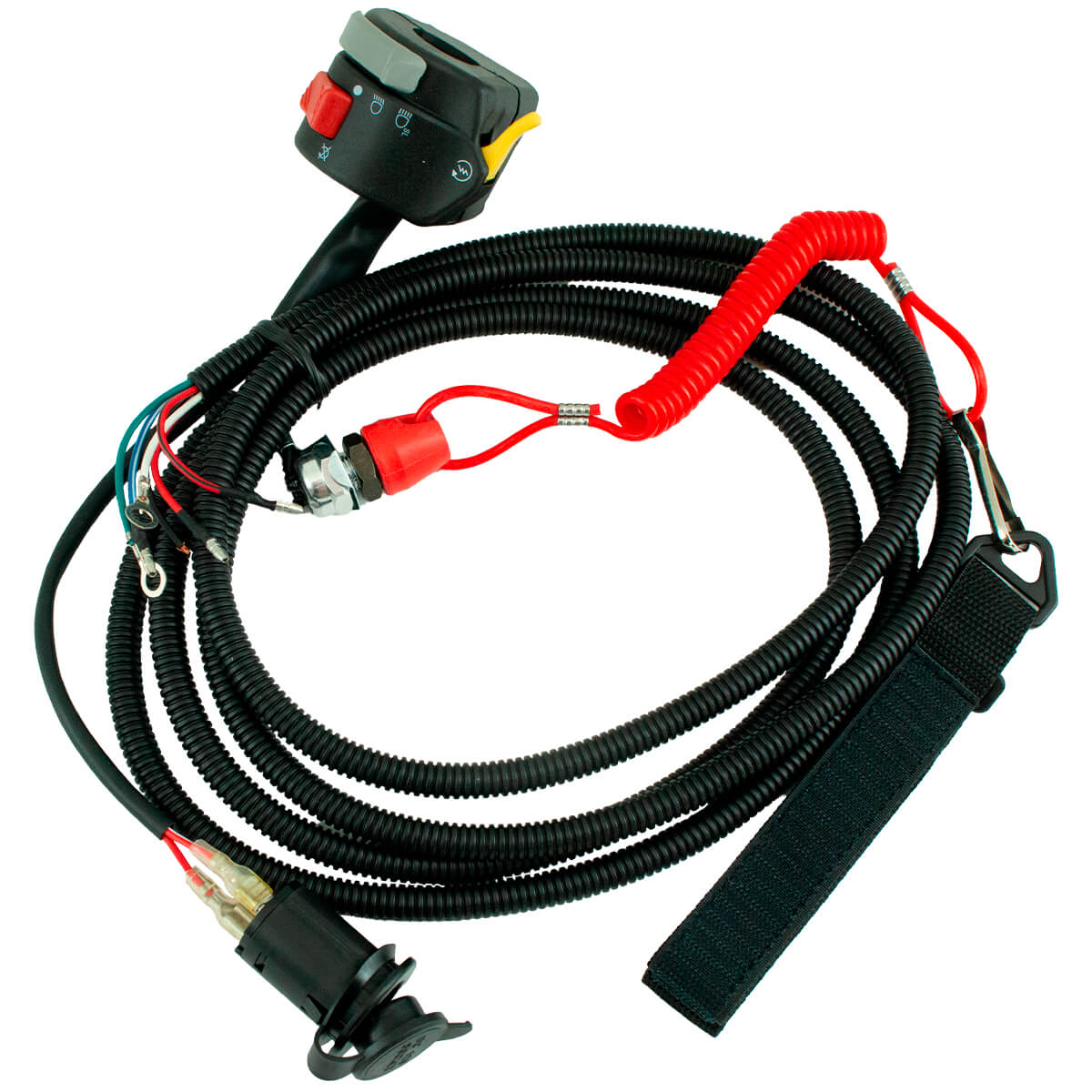 Переключатель рулевой в сборе с проводами, разъёмами, кнопкой электростартера и прикуривателем подходит для мотоциклов, скутеров, квадроциклов, снегоходов или мотобуксировщиков. Подходит для установки освещения и световых сигналов.