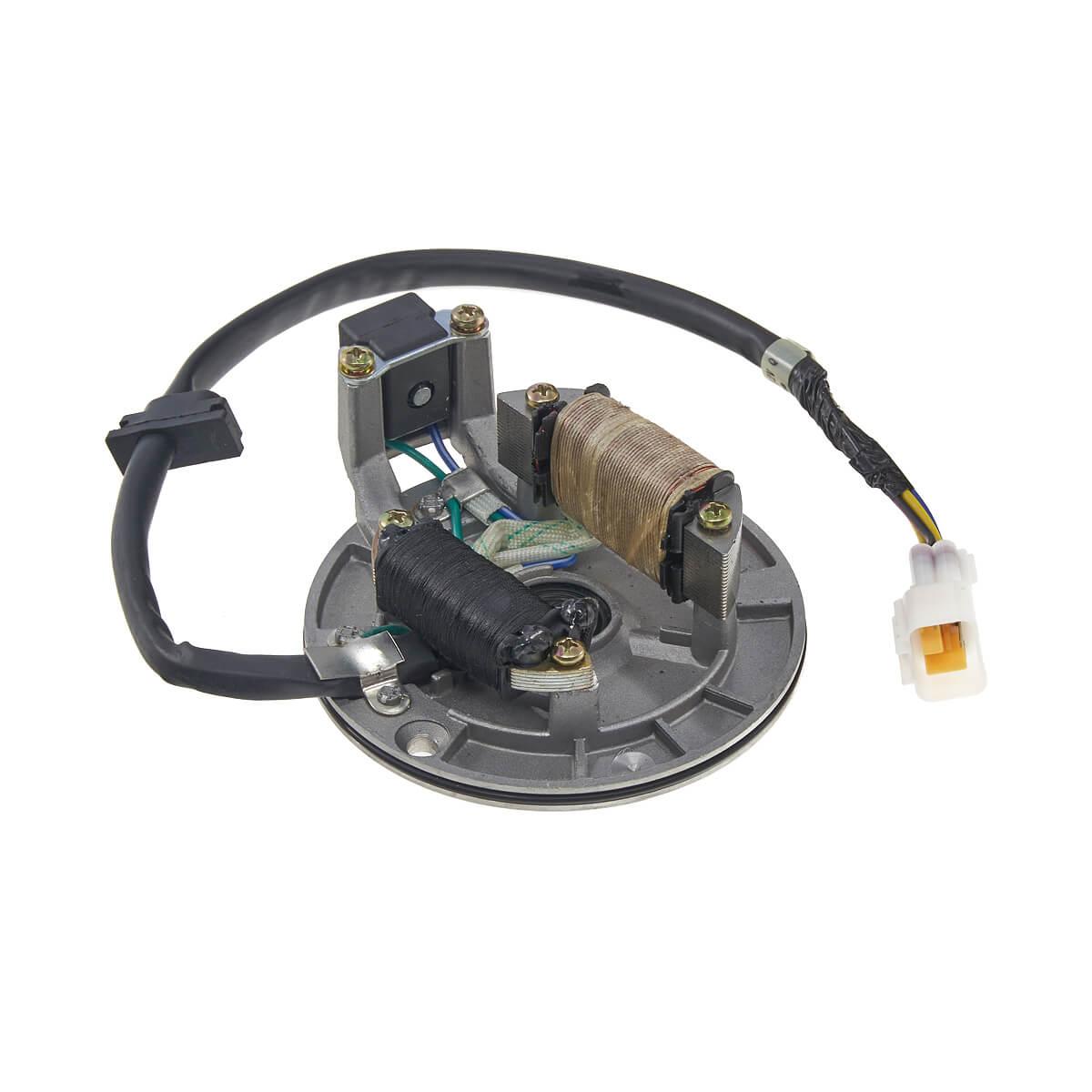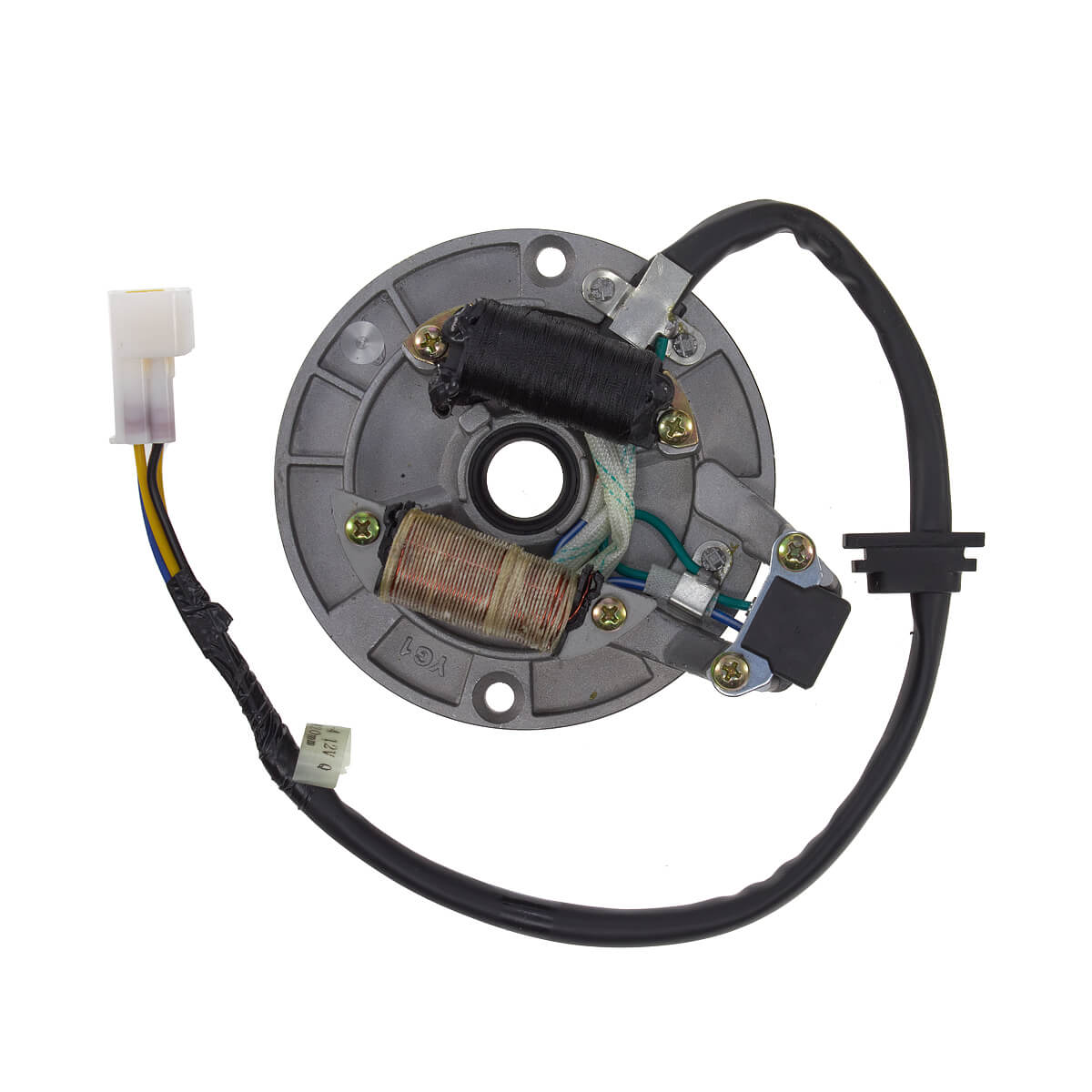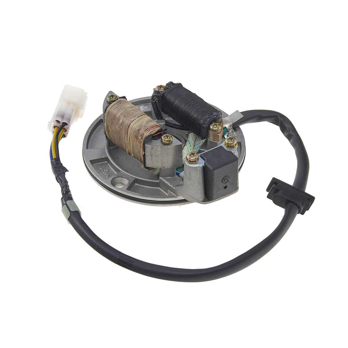 Статор генератора YCF двигателя KL1 на 2 катушки – неподвижная часть генератора. Состоит из обмоток на железном сердечнике, в которых генерируется электричество, необходимое для зарядки аккумулятора и обеспечения электроэнергией различных систем и компонентов.