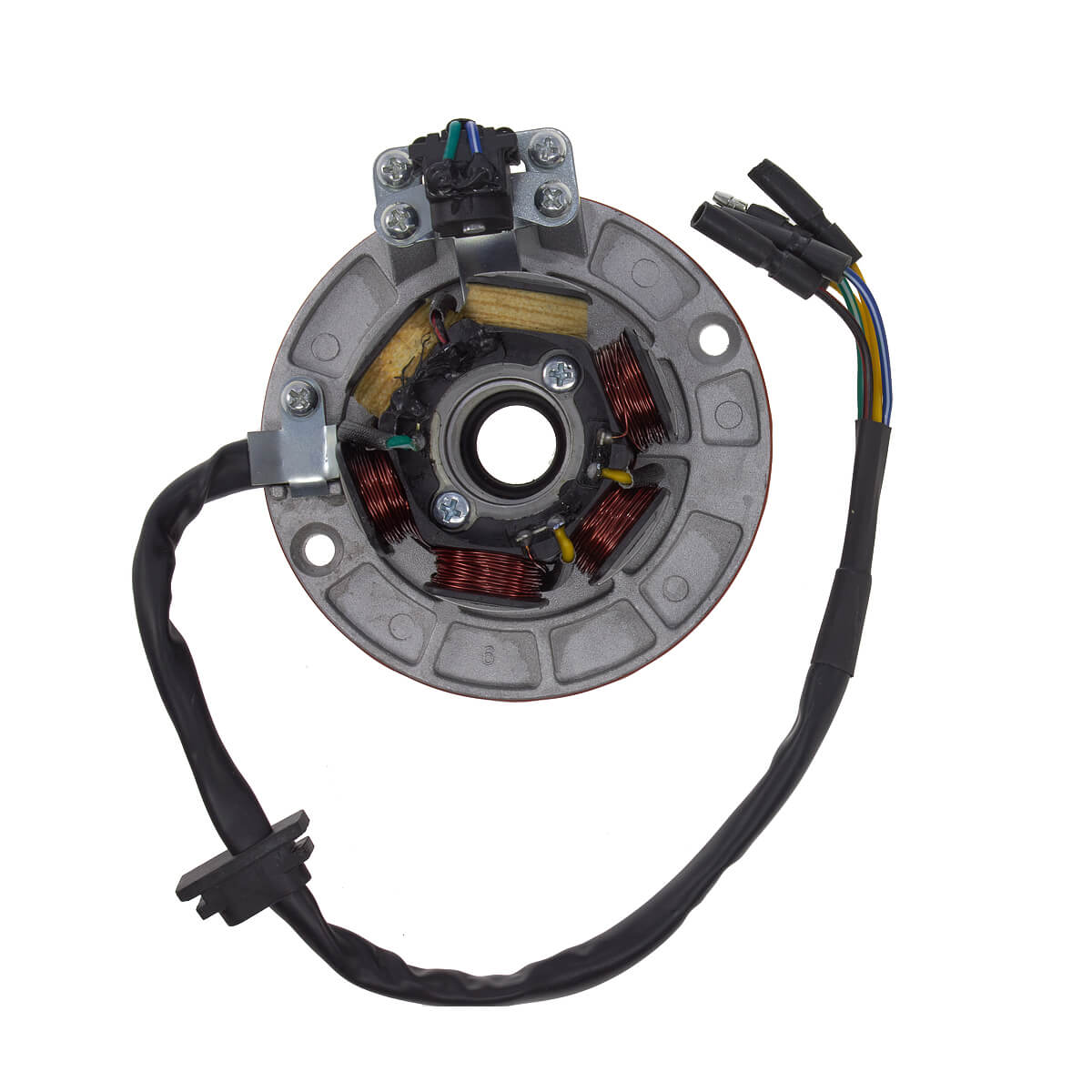 Статор генератора с катушкой освещения KAYO двигателя YX 140 см³ CN – неподвижная часть генератора. Состоит из обмоток на железном сердечнике, в которых генерируется электричество, необходимое для зарядки аккумулятора и обеспечения электроэнергией различных систем и компонентов.
