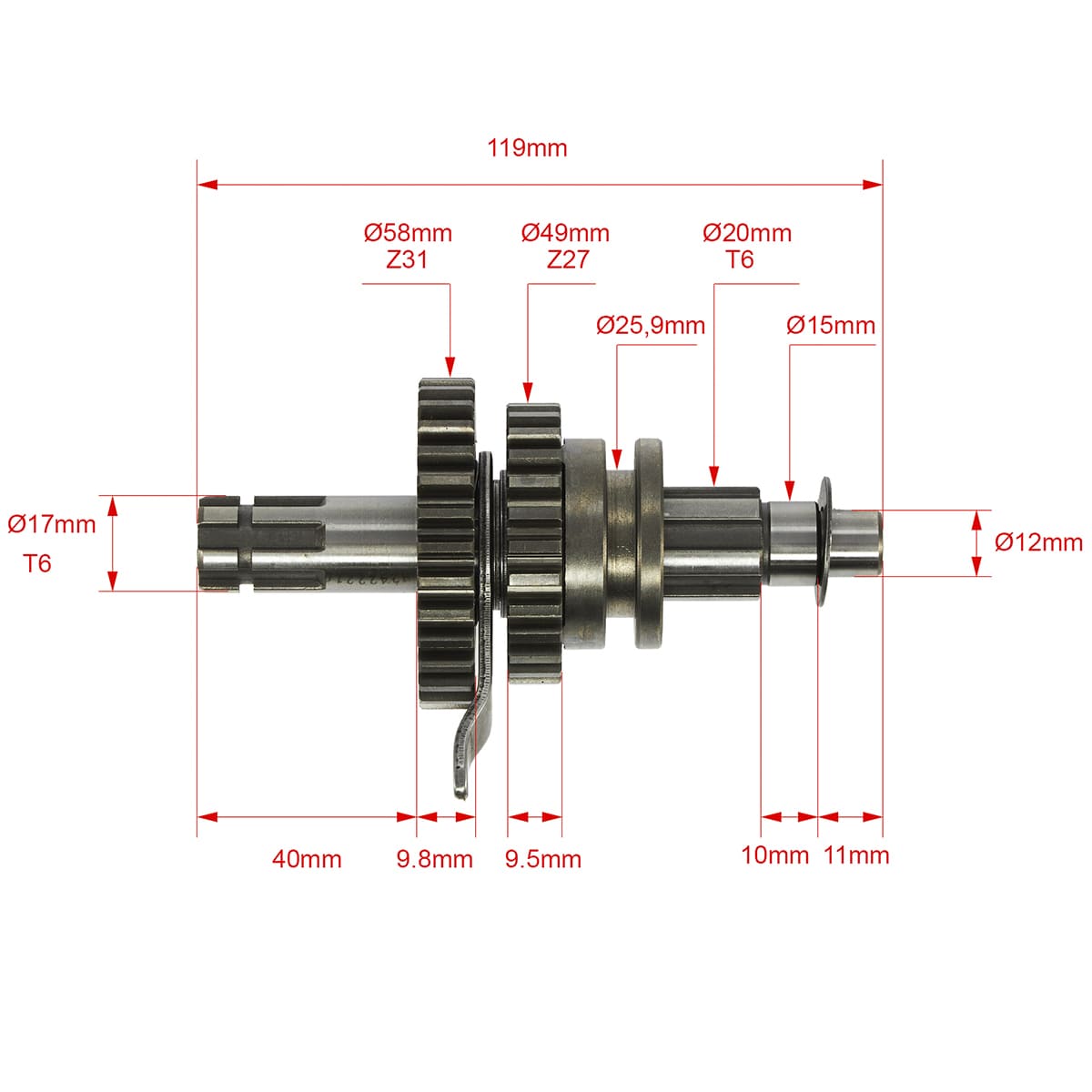 Комплект валов КПП KAYO двигателя YX125 см³ с задним ходом CN включает необходимые для сборки и функционирования коробки передач валы. Все измерения указаны на фотографиях.