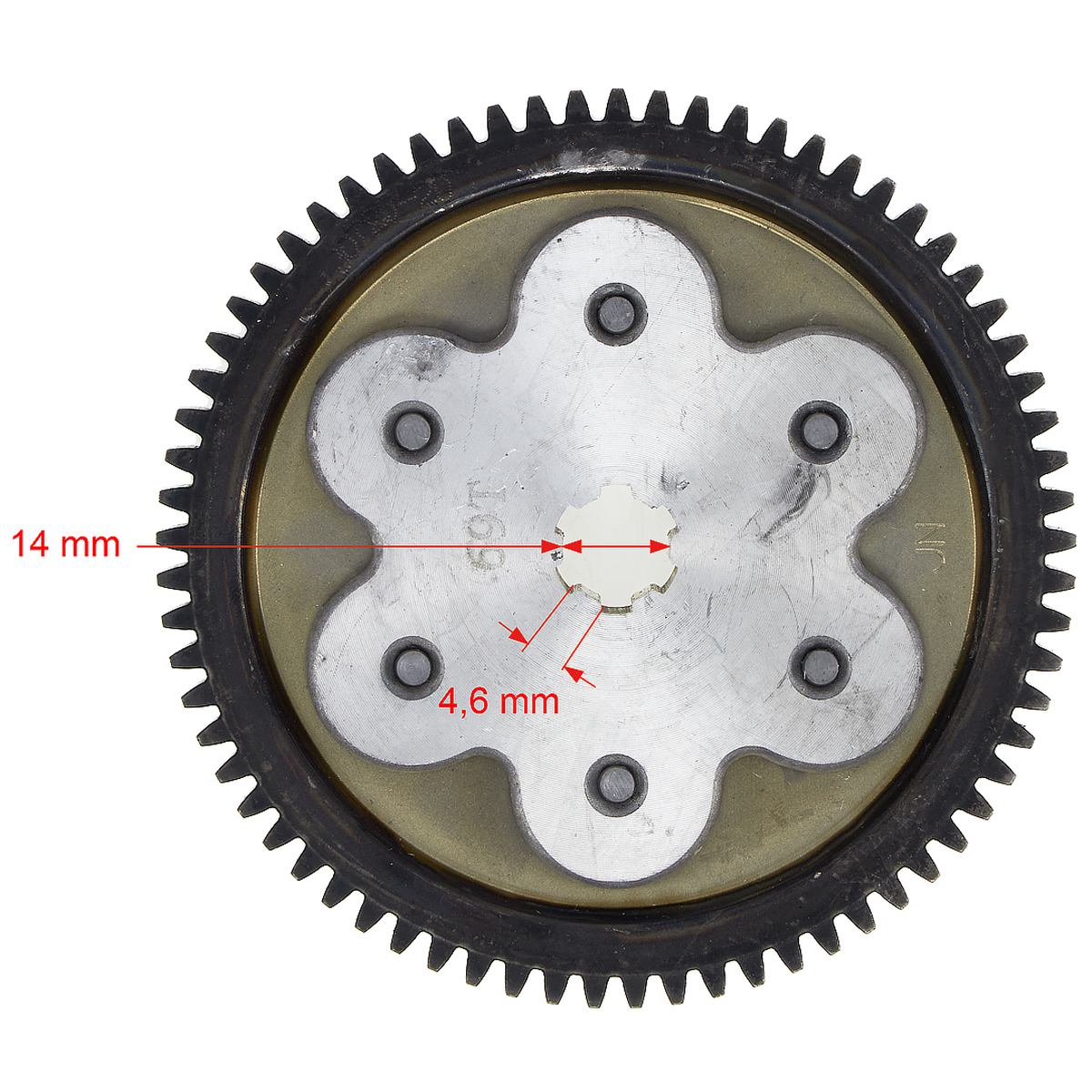 Шестерня сцепления двигателя YX110, 150 см³ с верхним электростартером 69Z передаёт движение от сцепления к другим компонентами трансмиссии, синхронизируя их работу. Все измерения указаны на фотографиях.