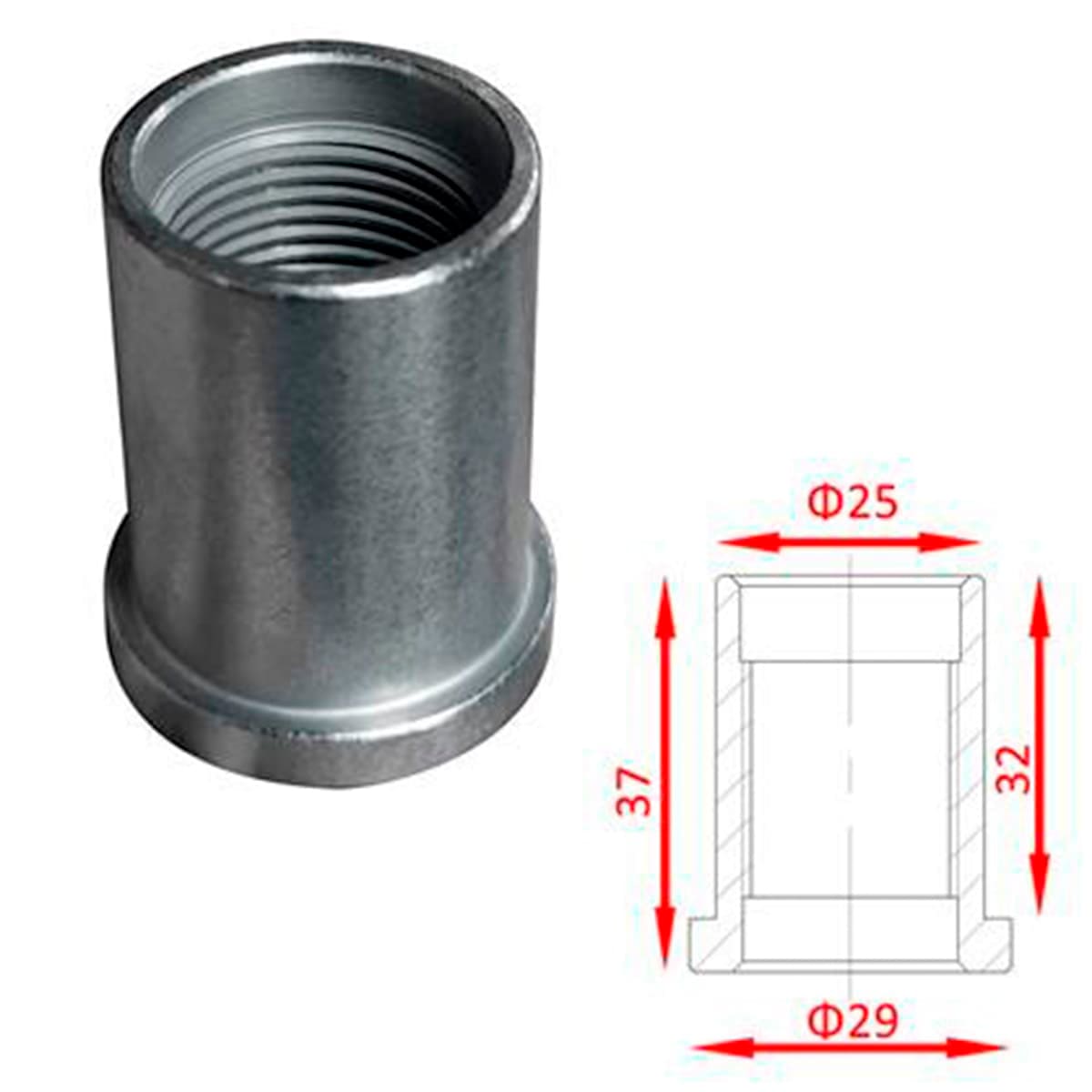 Диаметр втулки 25 мм, диаметр основания 29 мм, длина изделия 37 мм, длина без учёта основания 32 мм.